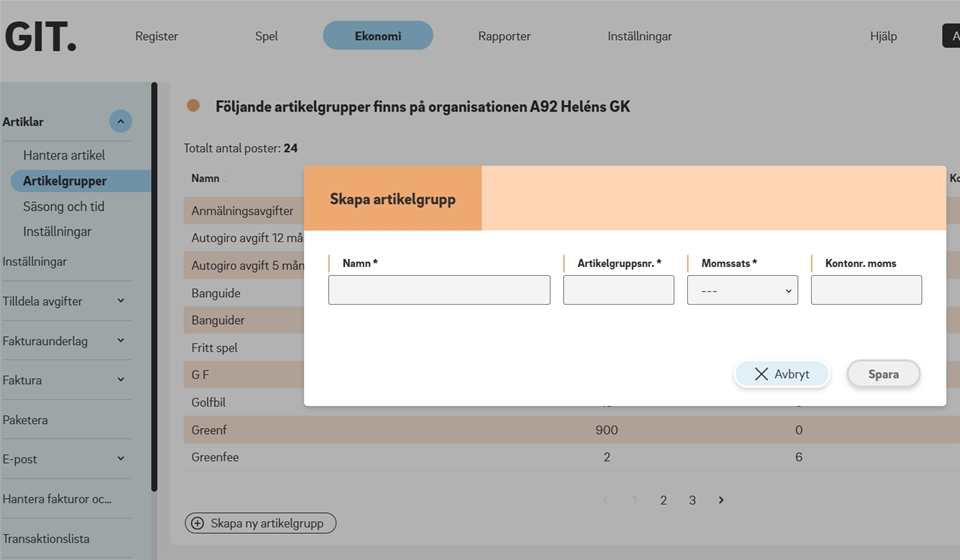 Här ser du en lista på alla klubbens artikelgrupper, klicka på pennan för att redigera.