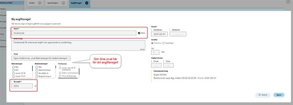 Fyll i ett beskrivande Namn och Beskrivning. Man kan ta bort bocken i rutan Aktiv för att tillfälligt avaktivera avgiftsregeln. Urvalet definierar den delgrupp av personer som omfattas av denna avgiftsregel. Du anger urvalet på samma sätt som vid urval för reservationer.