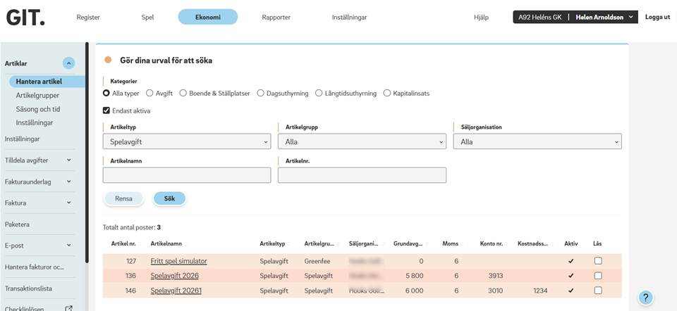 - Sök genom att skriva in hela eller delar av namnet på den artikel eller avgift du letar efter