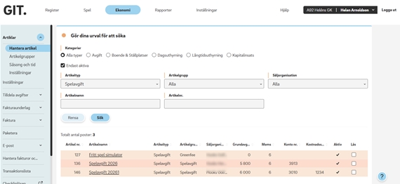 Ev. moms anges på resp. artikelgrupp som klubben lagt upp