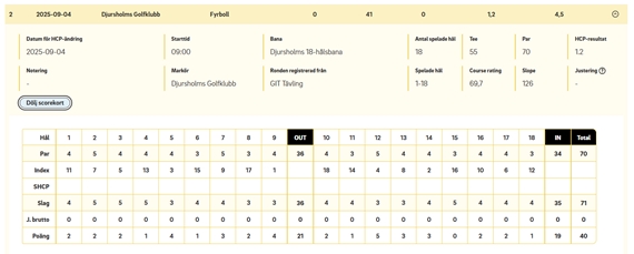 När hans runda registreras i GIT Tävling för handicapjustering, visas istället 41 poäng – eftersom GIT Tävling räknar poängen med 100 % reducering vid fyrboll.