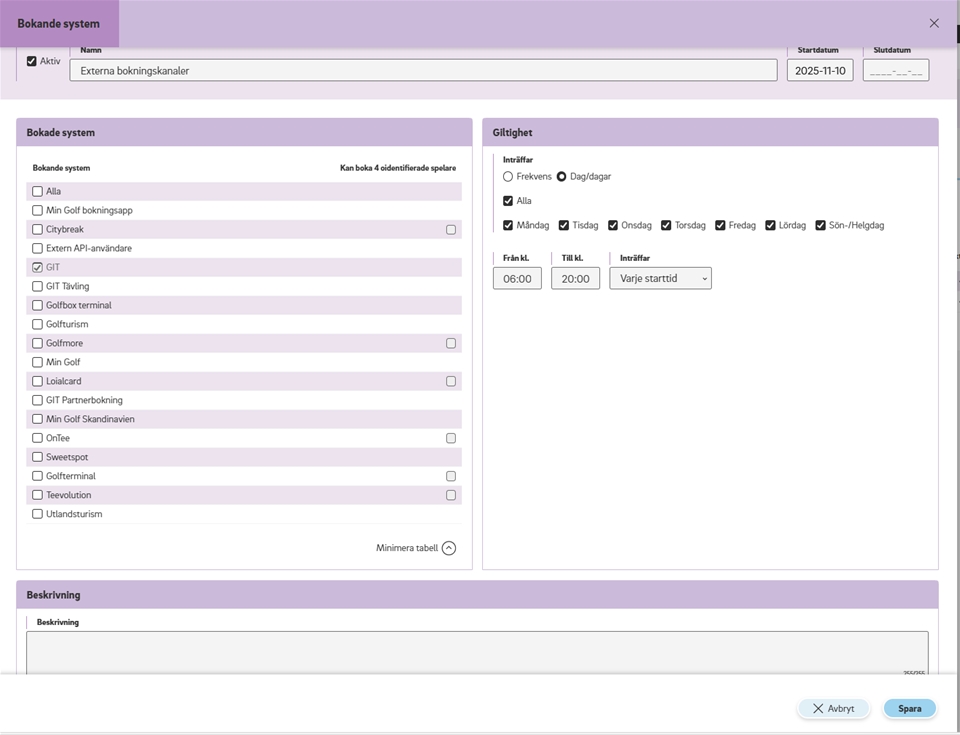 Bocka för de olika Bokande systemen (Externa Bokningskanaler) du önskar ska få möjlighet att boka på eran bana. Det finns en bokningskanal som är ikryssade i default och som inte heller kan kryssas ur, det är GIT. Övriga bokningskanaler behöver väljas av dig.