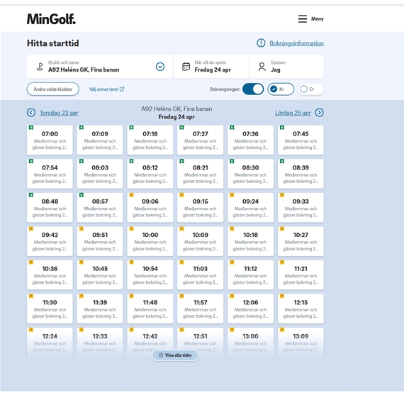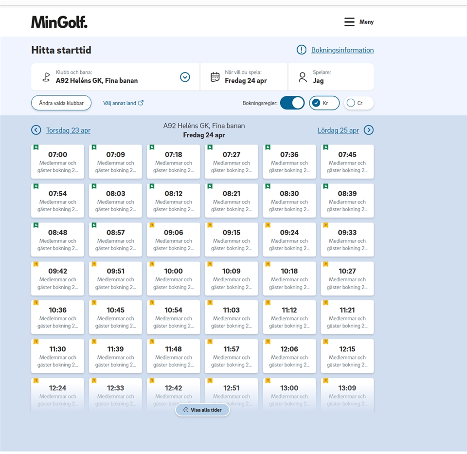 ✓ Klubben har ställt in att det inte spelar någon roll vilken färg starttiderna har varken för gäst eller medlem. Den siffra du anger i Totalt kommer alltid att vara överordnat siffran i grön, gul eller röd.