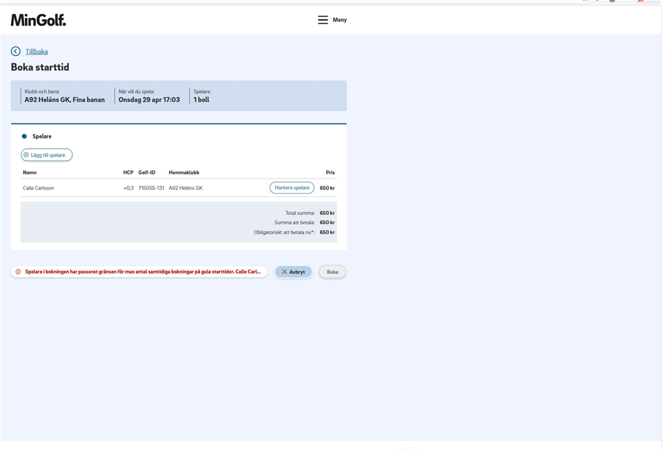 ✓ I bilden från Min Golf (längre ner på sidan) visas meddelande baserat på att spelaren (en gäst) redan har två bokningar