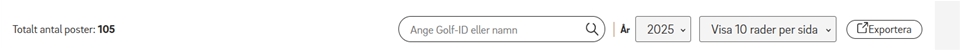 Sökfunktionen filtrerar direkt vid första inmatning av ett tecken och om du vill visa fler än 10 sökresultat på sidan kan du välja från dropdownlistan till höger. Du har också möjlighet att exportera datan till Excel.