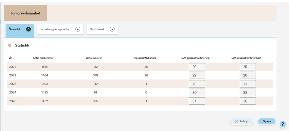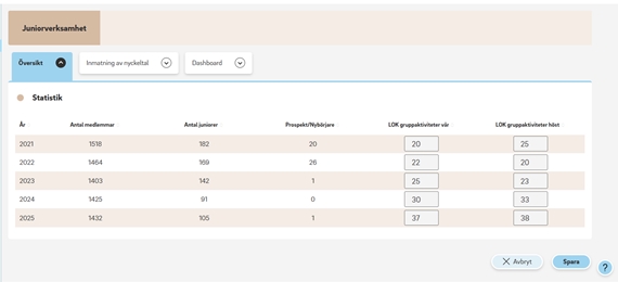 - Översikt : Innehåller medlemsstatistik och inmatningsrutor för LOK-stödsaktiviteter.