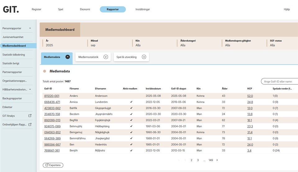 - Medlemsdata : Sökbara medlemsdata som också är det inlästa underlaget till alla statistikflikar