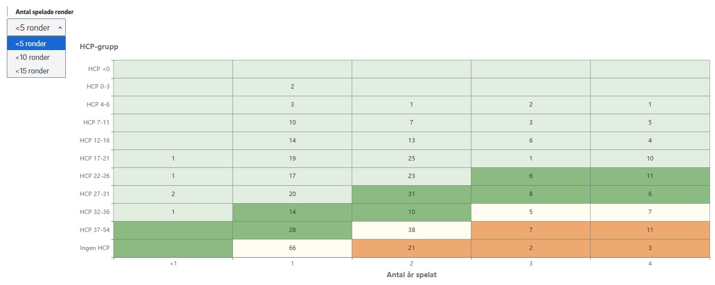 Skalan på matrisen visar utifrån nuvarande HCP vs Antal år medlemmen har varit medlem i klubben.