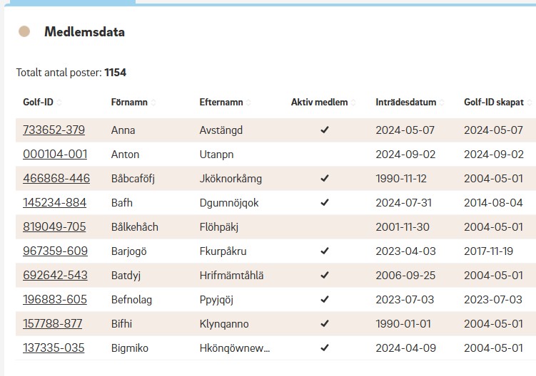 Kolumnen Golf-ID är innehåller Golf-IDs med en klickbar länk direkt till medlemmens personbild.