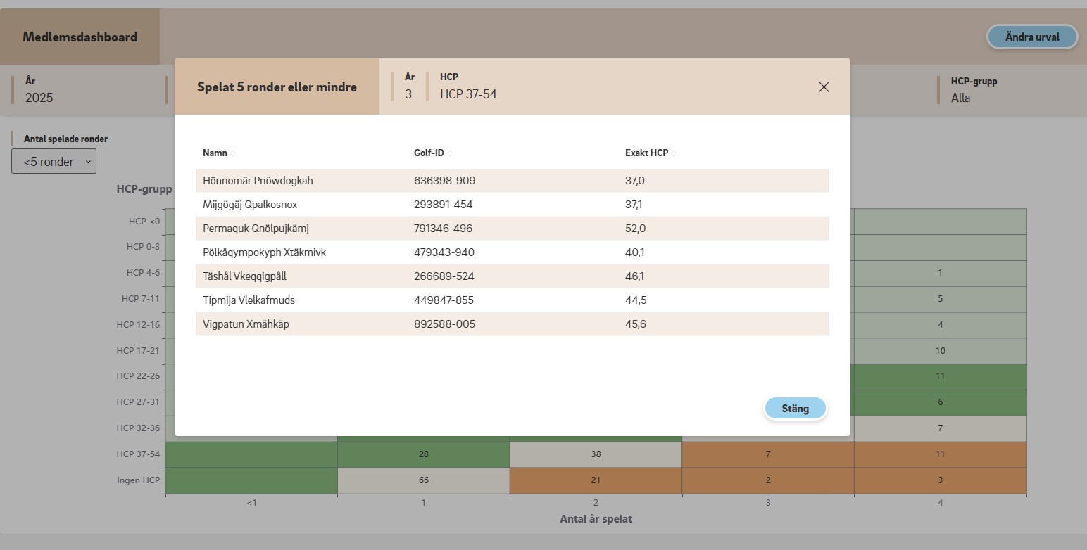 Klickar man på en ruta visas mer detaljinformation om medlemmen i frågan, deras Golf-ID samt exakt handicap.