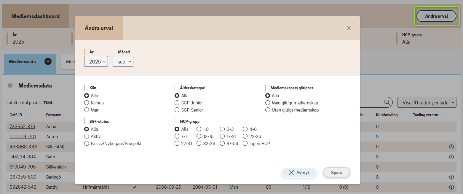 Urvalsfunktionen ligger upp till höger på sidan. Klickar man på knappen Ändra urval kan man välja/filtrera på olika datapunkter. Urvalsfunktionen slår genom på alla flikar.