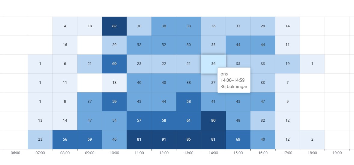 Visar en heatmap över hur mycket och när medlemmarna har bokat på klubbens egna banor under hela den pågående månaden (inklusive framtida bokningar). Väljer man urvalet ”Externa banor” visas heatmappen som tom, eftersom externt spel inte ingår i denna beräkning.
