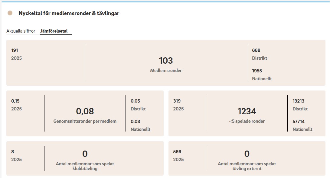 Visar total antal medlemsronder (på klubben och andra banor), genomsnittsronder per medlem samt antal medlemmar som har spelat 5 ronder eller mindre. Antal medlemmar som har spelat klubb- eller externe tävlingar visas också här.