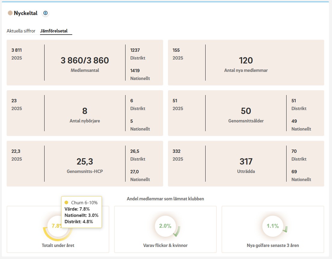 Visar olika nyckeltal (man kan välja mellan aktuella siffror och jämförelsetal) där de övre sex nyckeltal ändras utifrån vad som man har valt under Ändra urval.