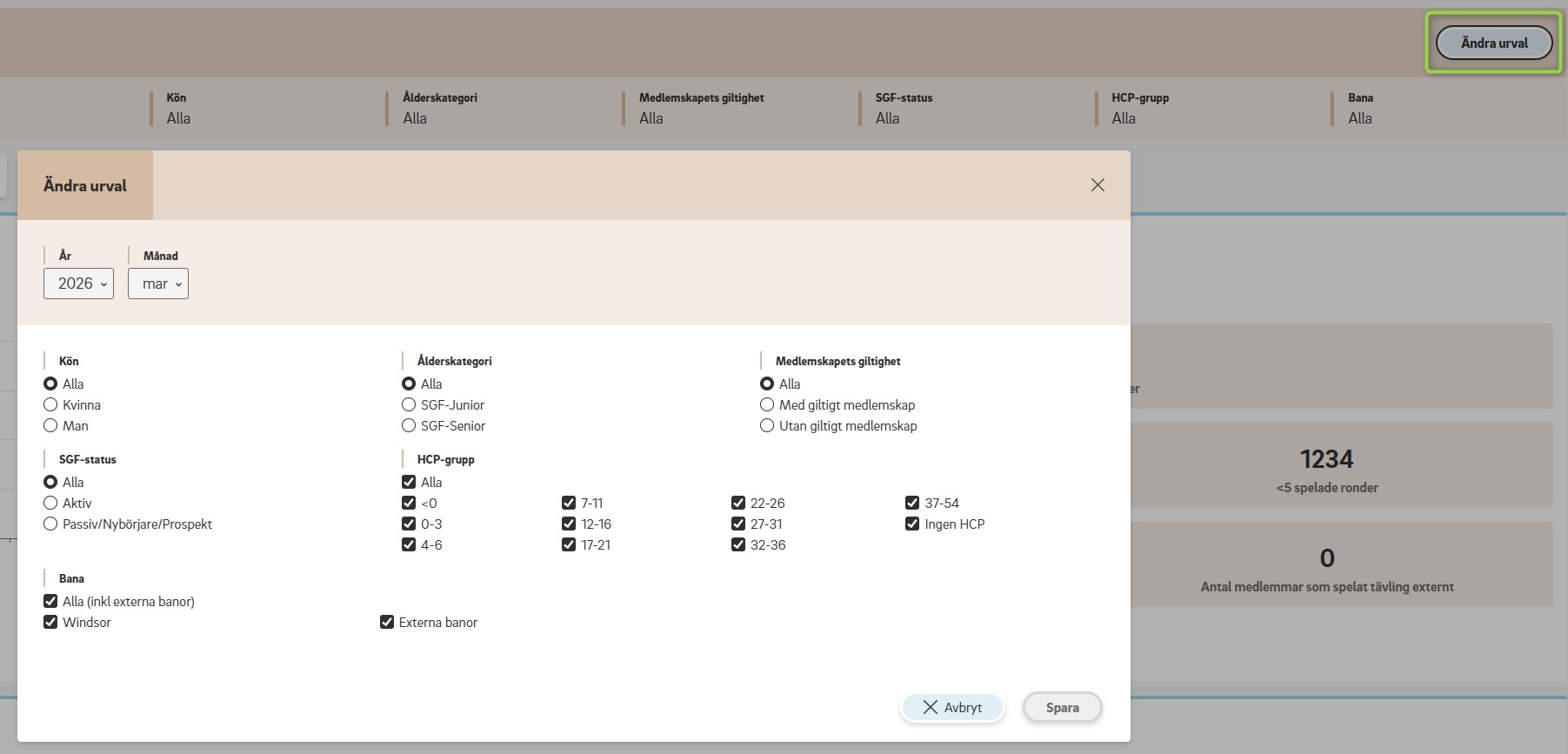 Urvalsfunktionen ligger upp till höger på sidan. Klickar du på knappen Ändra urval kan du välja/filtrera på olika datapunkter. Urvalsfunktionen slår genom på alla flikar med följande undantag: