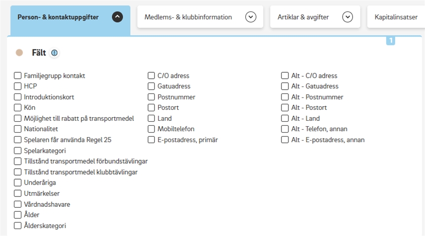 Klubbens alla kapitalinsatser samt kapitalinsatstyp kan filtreras.
