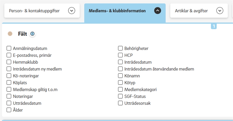 I det nya gränssnittet är urvalsparametrarna grupperade i fyra huvudrapportområden. Du kan välja urvalsparametrar från olika områden men varje område skapar en rapportflik för sig i Excel. Ordningen du väljer parametrarna definierar inte i vilken ordning kolumnerna kommer att visas i Excel.