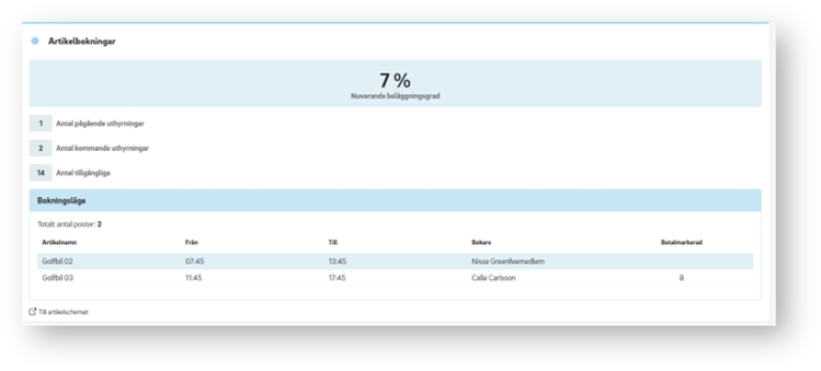 Widgeten för artikelbokning ger dig en snabb överblick över dina bokade golfbilar just nu och 4 timmar framåt.