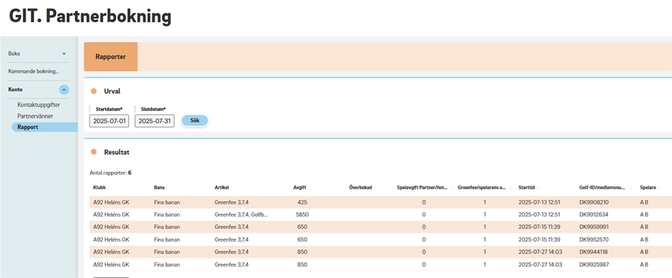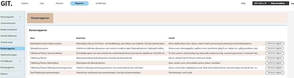 Via GIT Partnerbokning kan partnern själva ta fram en rapport över sitt spel.