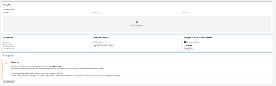 Under fliken Övrigt på personbilden hittar du: Noteringar Tillstånd för transportmedel Möjlighet till rabatt på transportmedel Info om behörighetsroller Spelarkategori Paragolf och regel 25 Samt funktionen radera person.