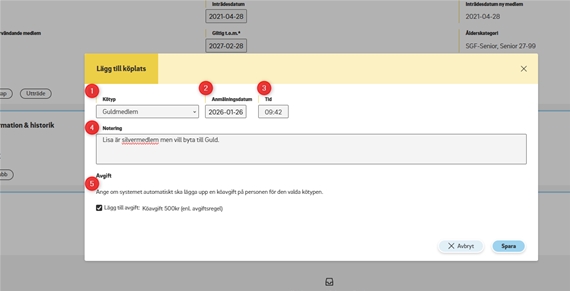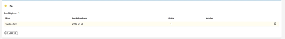 När personen är upplagd ser du enkelt , kötyp, anmälningsdatum vilken köplats samt ev. noteringar. Under klubbrelation längst upp till höger i personbilden finns också uppgifter om kö.