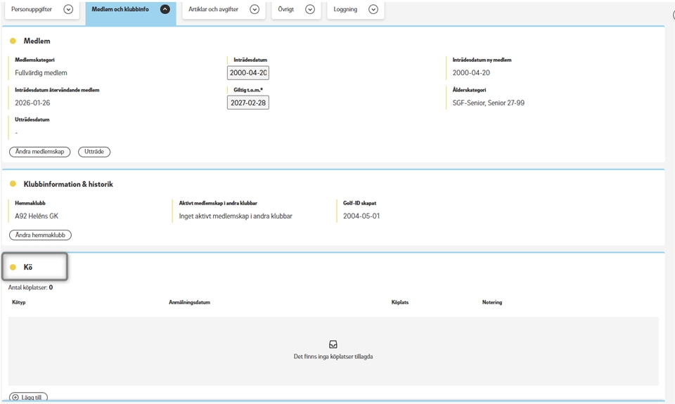 Under fliken Medlem och klubbinfo hittar du köfunktionen och eventuella köuppgifter visas under fliken Kö.