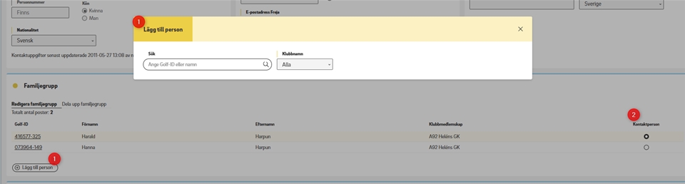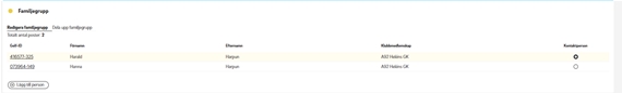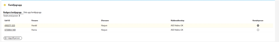 1. Med fliken Redigera familjegrupp markerad kan du klicka på övriga medlemmar i familjegruppen (klicka på deras Golf‑ID) för att komma till deras personbild. Här kan du också lägga till fler familjemedlemmar.