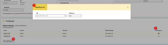 Klicka på Lägg till person och ett nytt fönster visas där man söker fram Personen. Sök på Golf-ID eller Namn, du kan också välja Klubbnamn för att få ett mindre urval. Denna funktion söker alltid i hela registret (hela Sverige) efter personer. Ett sökresultat visas, klicka på aktuell person och den läggs då direkt till i familjegruppen.